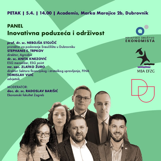 Panel rasprava “Inovativna poduzeća i održivost” koje zajedno organiziraju Hrvatsko društva ekonomista, Udruga MBA EFZG Alumni, Ekonomski fakultet Zagreb i